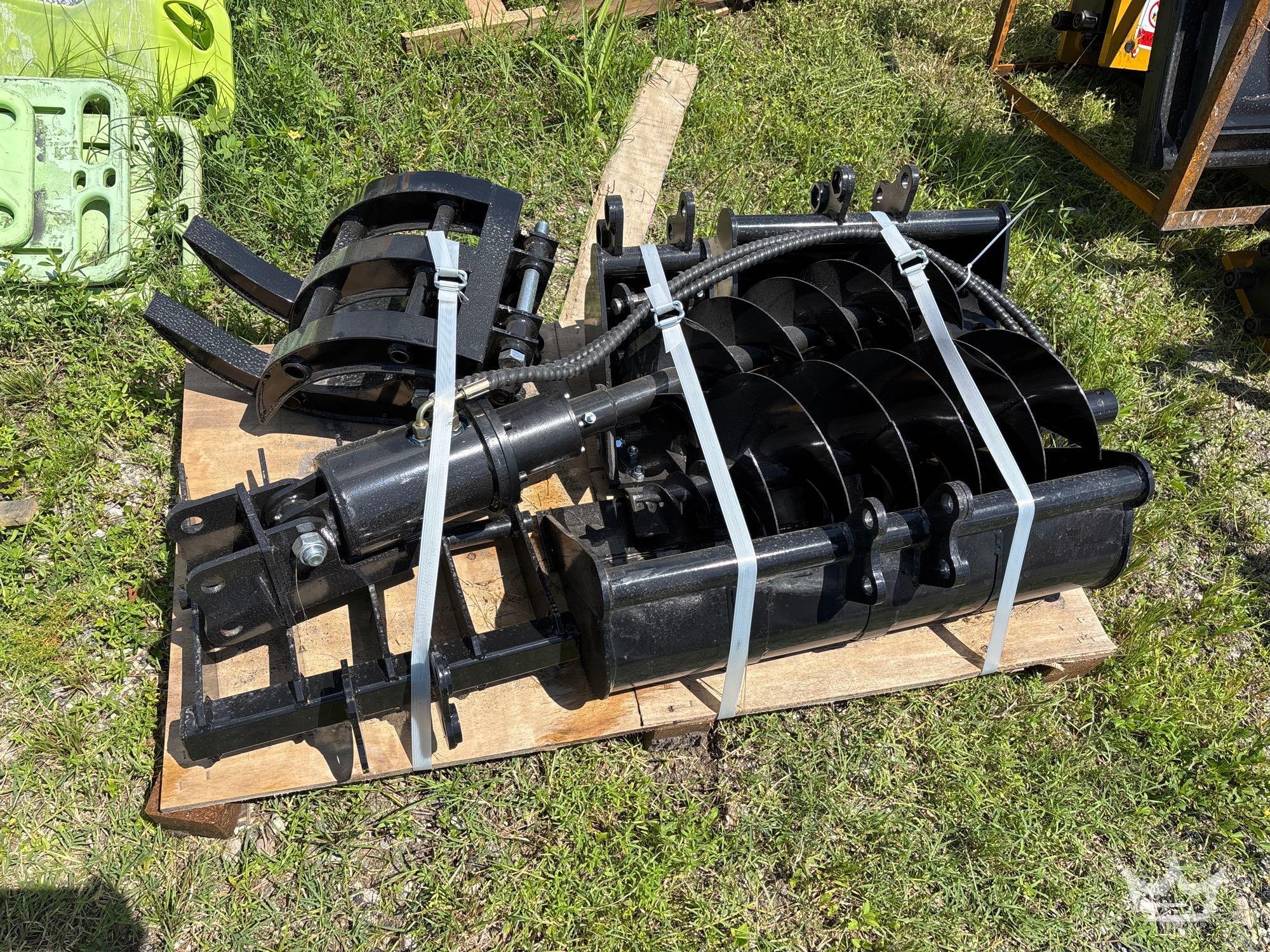 Set of 9 attachments; 32 in bucket, 20 in bucket, 8 in bucket, 8 and 12 in auger, grapple, ripper, rake, and quick hitch....